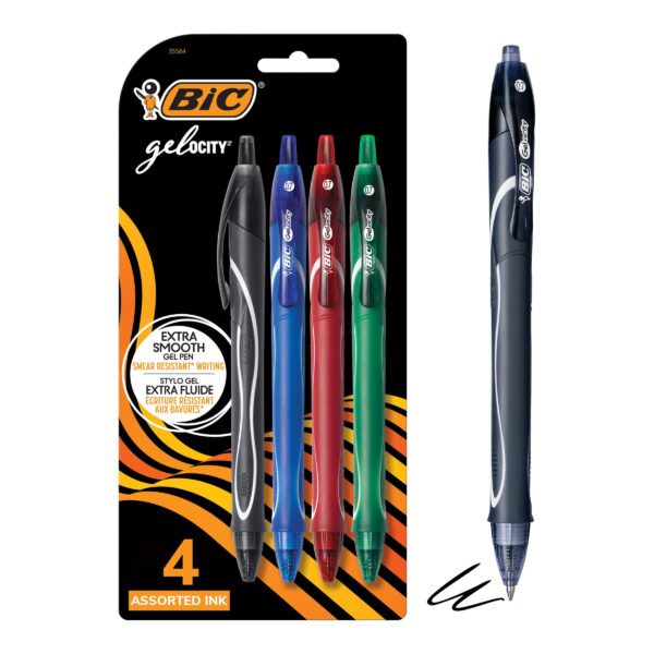 • One 4-count pack of BIC Gelocity Quick Dry Assorted Colors Gel Pens, Colors May Vary