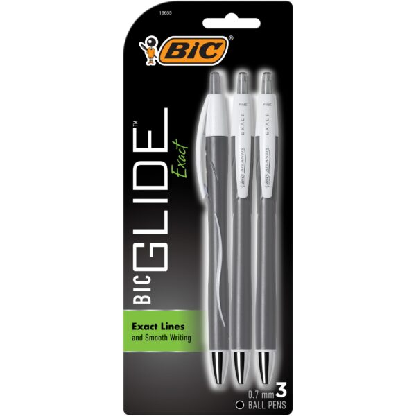 - Featuring sleek, comfortable barrels, BIC Glide Exact Retractable Ball Point Pens bring a precise touch to everyday writing tasks. Each retractable pen comes equipped with a 0.7mm fine point that creates exact, precise lines and ink that writes even smoother than the BIC classic ink system. A full grip area offers a controlled yet comfortable hold, ideal for prolonged writing sessions. BIC ballpoint pens have a convenient retractable design you can deploy and retract the tip with one smooth click.