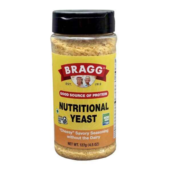 - Bragg Premium NUTRITIONAL YEAST SEASONING 4.5 oz. bottle with Shaker Top Delicious added to recipes and foods! Vegetarian, Gluten-FREE! Non-GMO & Sugar-FREE! Provides great-taste and nutrition when added to a wide variety of foods and recipes. Makes a healthy delicious seasoning when sprinkled on most foods, especially salads, vegetables, potatoes, rice, pasta and even popcorn! Add to soups, dips, spreads, cereals, juices and smoothies for added flavor and nutrition. It’s “cheese-like” flavor makes it a great low-sodium, cholesterol-free, delicious, healthy addition to recipes and foods. In addition to its great health benefits listed below, Bragg Premium Nutritional Yeast Seasoning is a versatile culinary ingredient for most recipes. It can be used as a condiment or in recipes. BRAGG PREMIUM NUTRITIONAL YEAST SEASONING BENEFITS • Non-GMO • Vegan • Vegetarian • Gluten-Free • Great Taste • Salt-Free • Nutritious • Sugar-Free • Vitamin B including natural Vitamin B12 • Kosher Certified