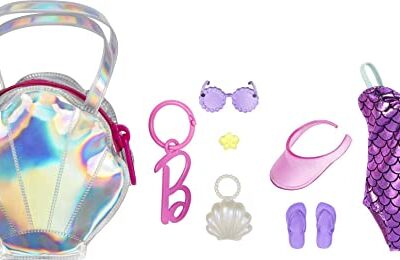 Barbie Clothes Set, Beach-Themed with Swimsuit, 5 Acessories & Zippered Doll-Sized Shell-Shaped Bag with Clip-On Ring, Iridescent